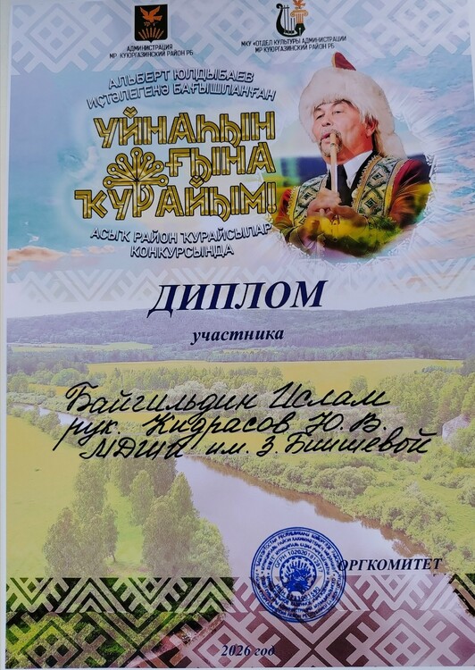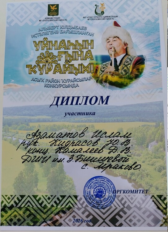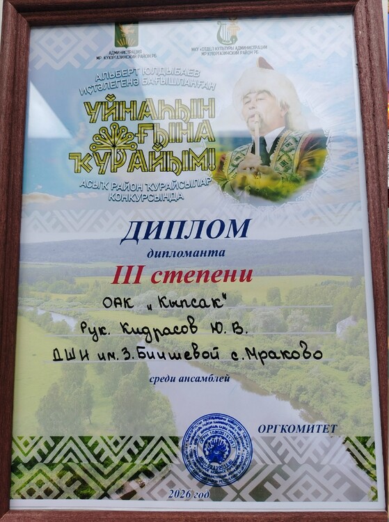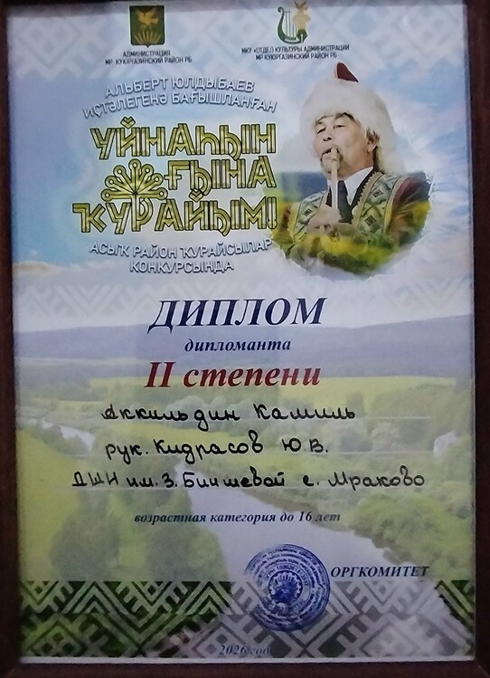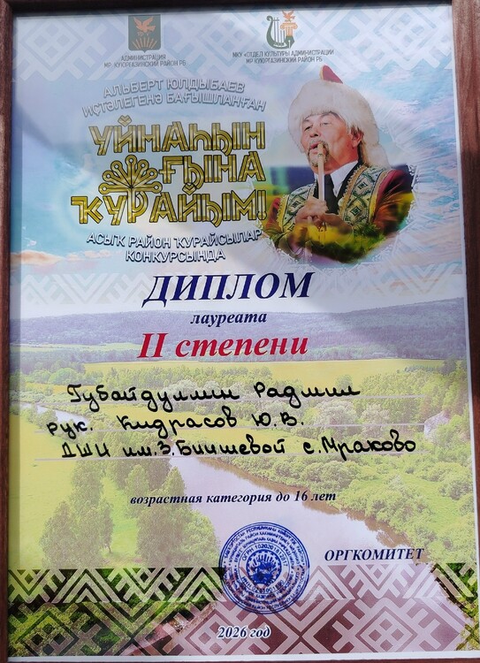 | В Куюргазинском районе в РДК «Йэшлек» прошел открытый районный конкурс кураистов «Уйнаһын ғына ҡурайым!», посвященный памяти нашего земляка, ценителя башкирской культуры Альберта Гайфулловича Юлдыбаева. Результаты наших кураистов: 2 место – Губайдуллин Радмил; 2 место – Аккильдин Камиль; 3 место – Ансамбль "Кыпсак". Дипломы участников у Байгильдина Ислама и Азаматова Ислама. Поздравляем всех участников, руководителя отделения "Башкирские народные инструменты (курай)" Кидрасова Ю.В. и неизменного концертмейстера Камалеева Д.М. | |