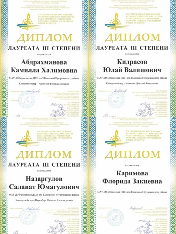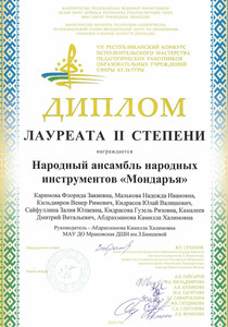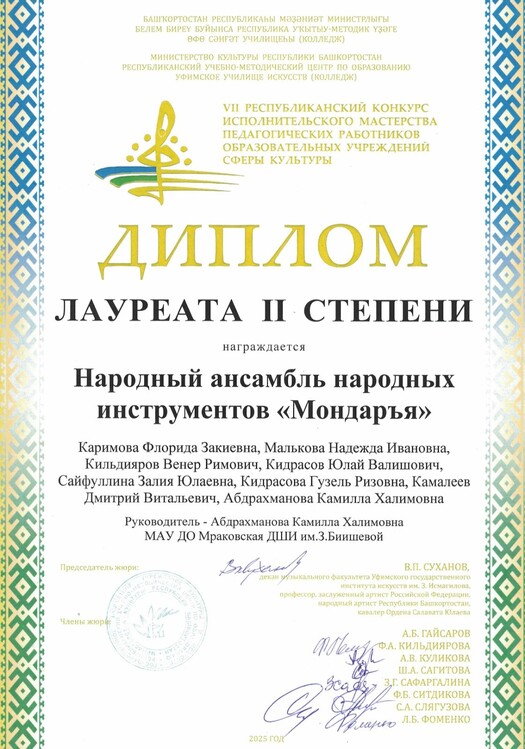 | 21 ноября в г.Уфа на базе Уфимского училища искусств (колледжа) прошёл третий заключительный этап VII Республиканского конкурса исполнительского мастерства педагогических работников образовательных учреждений сферы культуры. На конкурс было представлено более 230 заявок, это более 1000 педагогических работников образовательных учреждений сферы культуры Республики Башкортостан – детских музыкальных школ и школ искусств, музыкальных колледжей и колледжей искусств и культуры. К финалу конкурса допущено более 100 участников, продемонстрировавших высокий уровень мастерства инструментальных, вокальных ансамблей, солистов всех специальностей сферы культуры. Жюри под председательством декана музыкального факультета Уфимского государственного института искусств им.З.Исмагилова, профессора, заслуженного артиста Российской Федерации, народного артиста Республики Башкортостан, кавалера Ордена Салавата Юлаева Владимира Павловича Суханова подвело итоги конкурса. Каждый из нашей делегации участников приехал с конкурса с прекрасным результатом! Вот они: 🎶 народный ансамбль народных инструментов "Мондаръя" (руководитель Камилла Абдрахманова) - лауреат 2 степени (инструментальное исполнительство); 🎶Гульнара Салаватовна Журынкина - лауреат 2 степени (эстрадный вокал); 🎶 Камилла Халимовна Абдрахманова (скрипка), концертмейстер Флорида Закиевна Каримова (фортепиано) - лауреат 3 степени; 🎶 Юлай Валишович Кидрасов (курай), концертмейстер Дмитрий Витальевич Камалеев (баян) - лауреат 3 степени; 🎶 Салават Юмагулович Назаргулов (туба), концертмейстер Надежда Александровна Ниренберг (фортепиано) - лауреат 3 степени; 🎶 Флорида Закиевна Каримова (фортепиано) - дипломант! Мы от души поздравляем преподавателей Мраковской детской школы искусств им. З. Биишевой с достойным выступлением на конкурсе! Желаем вам здоровья, благополучия и новых творческих успехов! | |