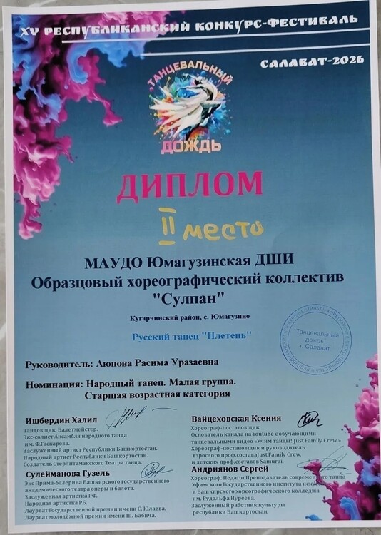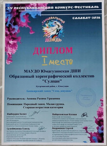 | Образцовый хореографический коллектив «Сулпан» Юмагузинской детской школы искусств блестяще выступил на Республиканском конкурсе-фестивале «Танцевальный дождь» в городе Салавате! От всей души поздравляем юных артистов и их талантливого руководителя Аюпову Расиму Уразаевну с заслуженной победой. Это огромное достижение, результат упорного труда и преданности искусству. Желаем коллективу «Сулпан» дальнейших творческих успехов, новых ярких выступлений и неиссякаемого вдохновения! | |