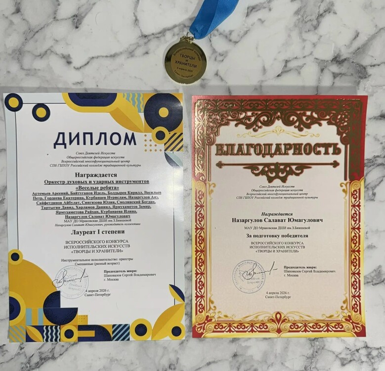 | 4 апреля 2026 года оркестр духовых и ударных инструментов «Весёлые ребята» под руководством Назаргулова Салавата Юмагуловича достойно представил свое мастерство на Всероссийском конкурсе исполнительских искусств «Творцы и хранители», который прошел в г. Санкт-Петербург. Коллектив продемонстрировал высокий уровень подготовки, покорив жюри и зрителей. По итогам конкурсных выступлений оркестр был удостоен звания лауреата I степени! Председателем жюри конкурса выступил Шаповалов Сергей Владимирович (г. Москва), который высоко оценил профессионализм участников и художественную выразительность их исполнения. Поздравляем оркестр «Весёлые ребята» и его руководителя с блестящей победой! Желаем дальнейших творческих успехов, вдохновения и новых ярких достижений! | |