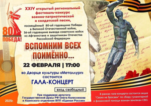 В районном дворце культуры «Металлург» г.Аша Челябинской области, в рамках Года единства народов России, состоялся XXV Открытый региональный фестиваль-конкурс военно-патриотической и солдатской песни «Вспомним всех поименно…», посвященный Дню Защитника Отечества и 37-летию вывода советских войск из Афганистана.