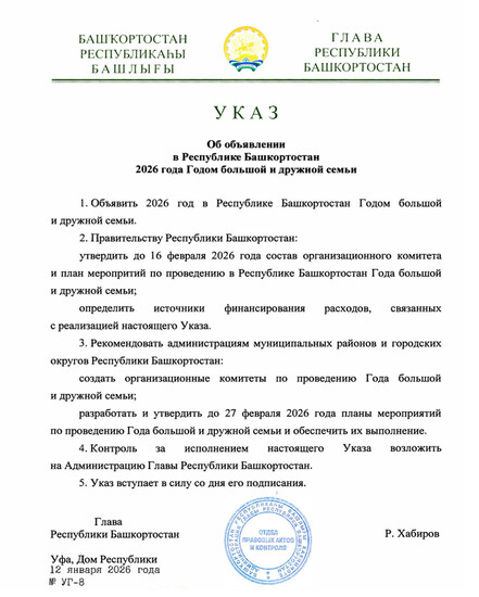 | 2026 год в Башкортостане объявлен «Годом большой и дружной семьи» по решению главы Республики Башкортостан Радия Хабирова. Цель такого решения — подчеркнуть значимость семейных ценностей и сплотить жителей региона вокруг общей цели: укрепления семей, пропаганды здорового образа жизни и заботы о близких. В рамках Года запланированы различные мероприятия, среди которых: - Фестивали семейного творчества: выступления, концерты и выставки, демонстрирующие таланты каждой семьи. - Дискуссионные площадки: конференции и круглые столы для обсуждения актуальных общественных проблем и поиска решений. - Массовые спортивные мероприятия: соревнования для всех возрастов и уровней подготовки. - Социальные инициативы: поддержка многодетных семей, одиноких родителей и старшего поколения. Радий Хабиров отметил, что семья — это основа благополучия и стабильности, и, объединившись, жители республики смогут преодолеть любые трудности и достичь значительных успехов. | |